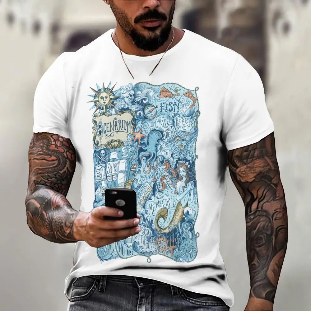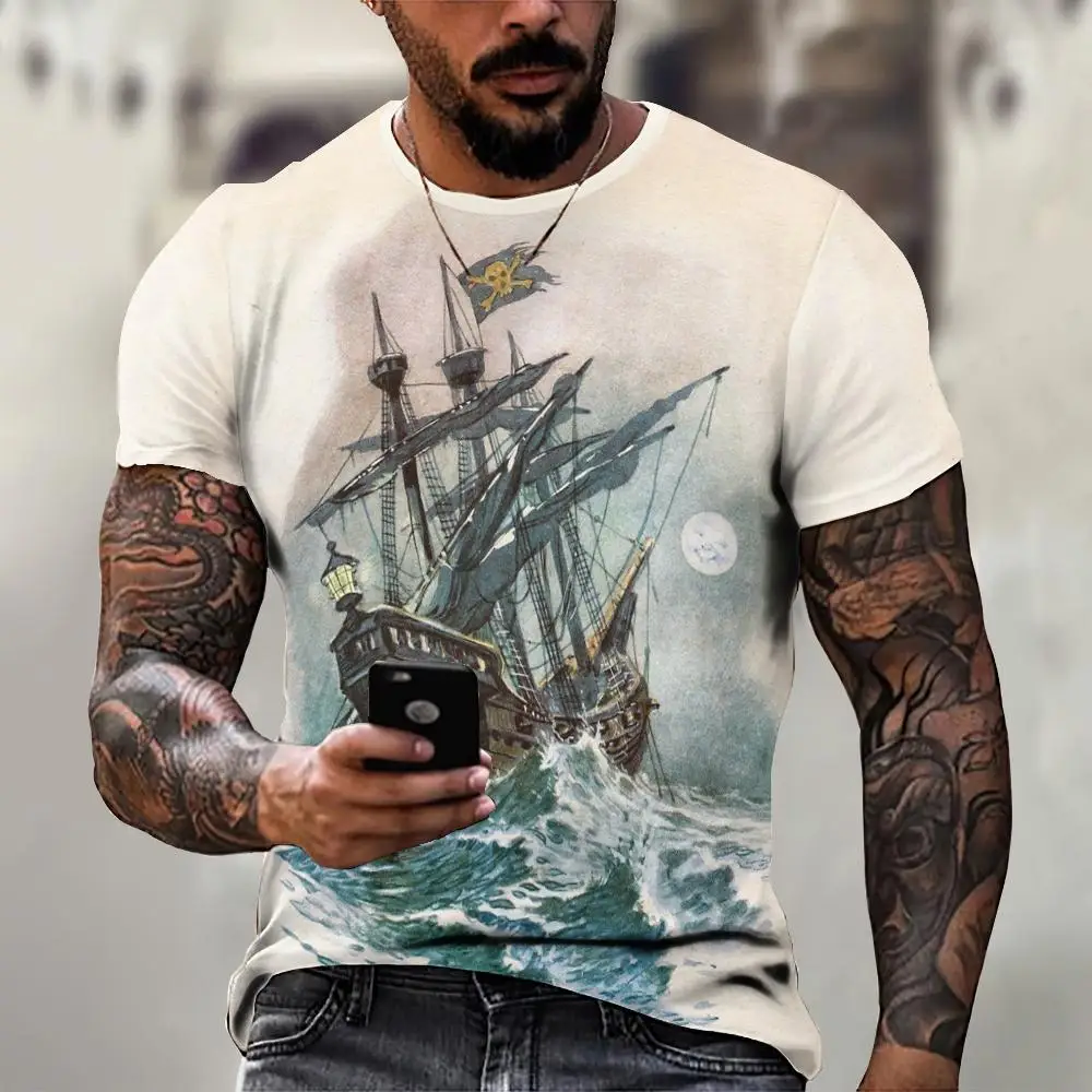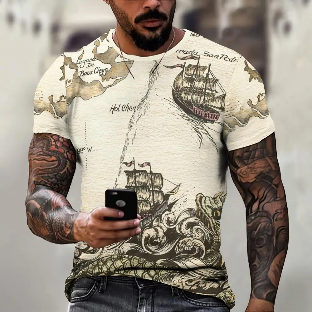 Vintage Men’s T-shirt Ship Anchor Shirt Tops Compass Printed Short-sleeve Tees Loose Daily Men Clothing Casual Streetwear